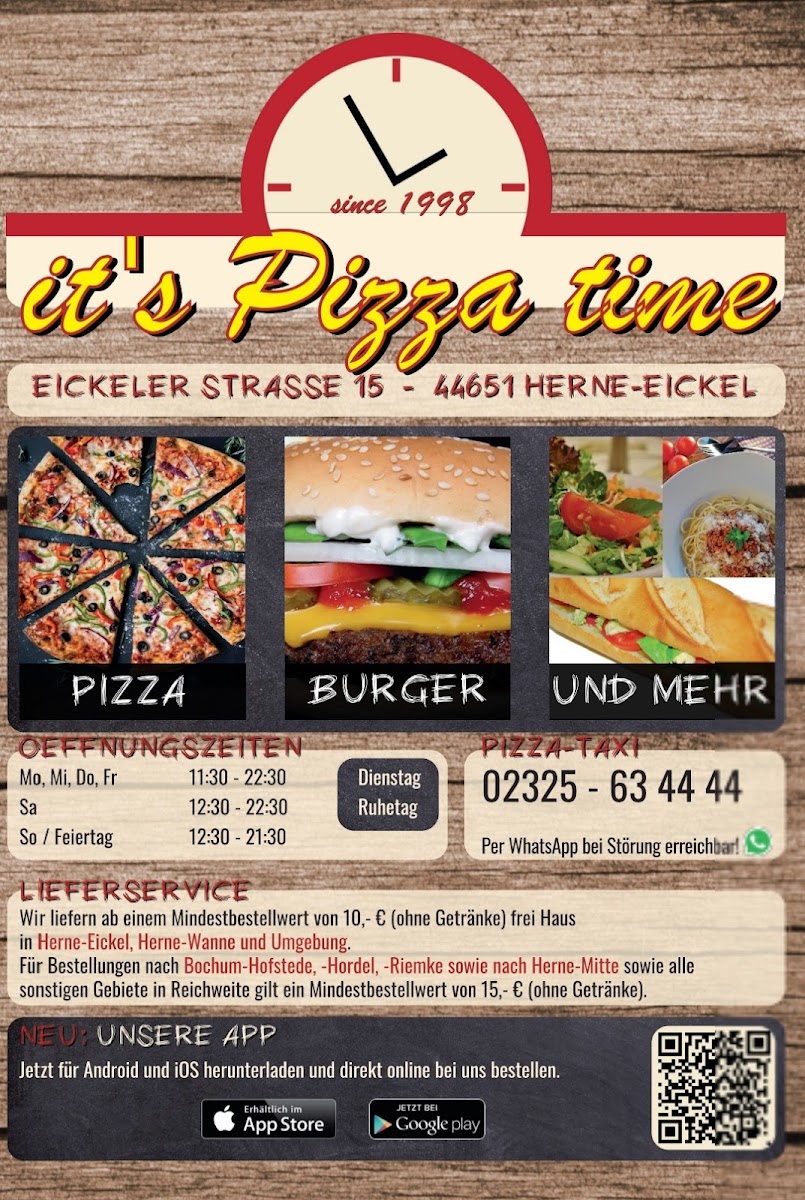 Welcome to "It's pizza time," a delightful pizza restaurant nestled in Herne, Germany. Located at Eickeler Str. 15, this cozy eatery has won the hearts of locals with its fast service and delicious offerings. Customers rave about the variety of pizzas, including the standout Käserand pizza, alongside scrumptious Baguettes and Nudelgerichte that elevate the menu. Those with dietary restrictions will appreciate options like potato gratin, safe from gluten reactions. What truly sets "It's pizza time" apart is its friendly and inviting staff, creating a warm atmosphere that keeps patrons returning. Whether you're picking up a quick meal or ordering for a cozy night in, the quality and freshness of the food shine through. Fans like Lima and Klara W. regularly recommend the establishment, and it's not hard to see why. Experience the joy of authentic pizza; here, every visit feels like a treat!